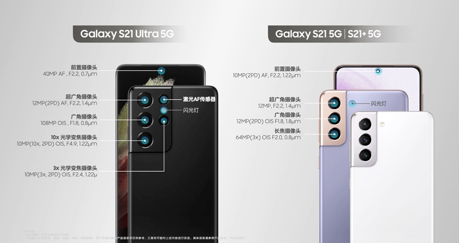 三星Galaxy S21相機(jī)參數(shù),Galaxy S21S21+ 5G擁有1200萬像素超廣角攝像頭、1200萬像素廣角攝像頭、6400萬像素長焦攝像頭以及1000萬像素前置攝像頭;Galaxy S21 Ultra擁有1200萬像素超廣角攝像頭、1.08億像素廣角攝像頭、1000萬像素10x光學(xué)變焦攝像頭、1000萬像素3x光學(xué)變焦攝像頭以及4000萬像素前置攝像頭。
