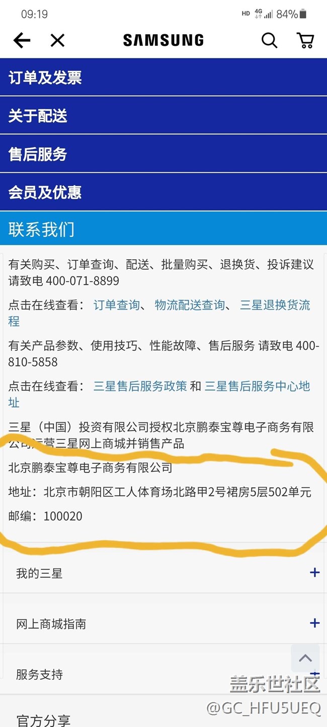 先打三星官網(wǎng)客服投訴,之后在拔打01012315投訴,因?yàn)槿蔷W(wǎng)上商城歸屬于北京工商局管轄范圍(12315電話很忙,一般要幾分鐘至十幾分鐘才能接通,聽筒里一直播放古箏音樂,要有耐心,圖中*圈里是商城地址,需要告之工商局客服人員)人多力量大,一定要維護(hù)我們的權(quán)益