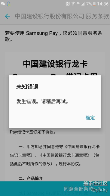 samsung pay是最新版本,每回一到同意條款就跳出這個,工行和建設(shè)都試過了
