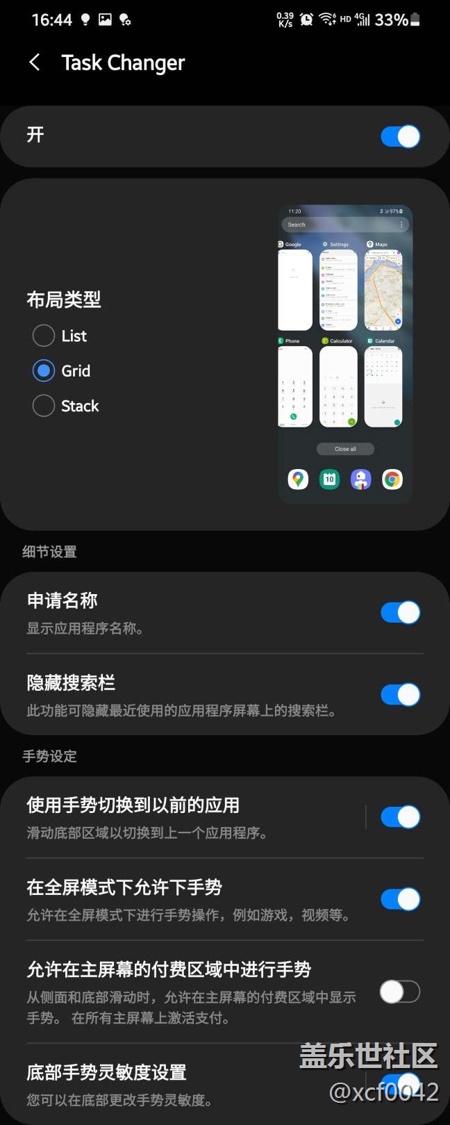 四、回到goodlock,打開(kāi)homeup,打開(kāi)taskchanger。打開(kāi)第一個(gè)按鈕。同時(shí),把倒數(shù)第三,第四按鈕打開(kāi)。這樣,就可以在隱藏狀態(tài)使用左右滑動(dòng)切換,且在橫屏下也能使用。如圖。