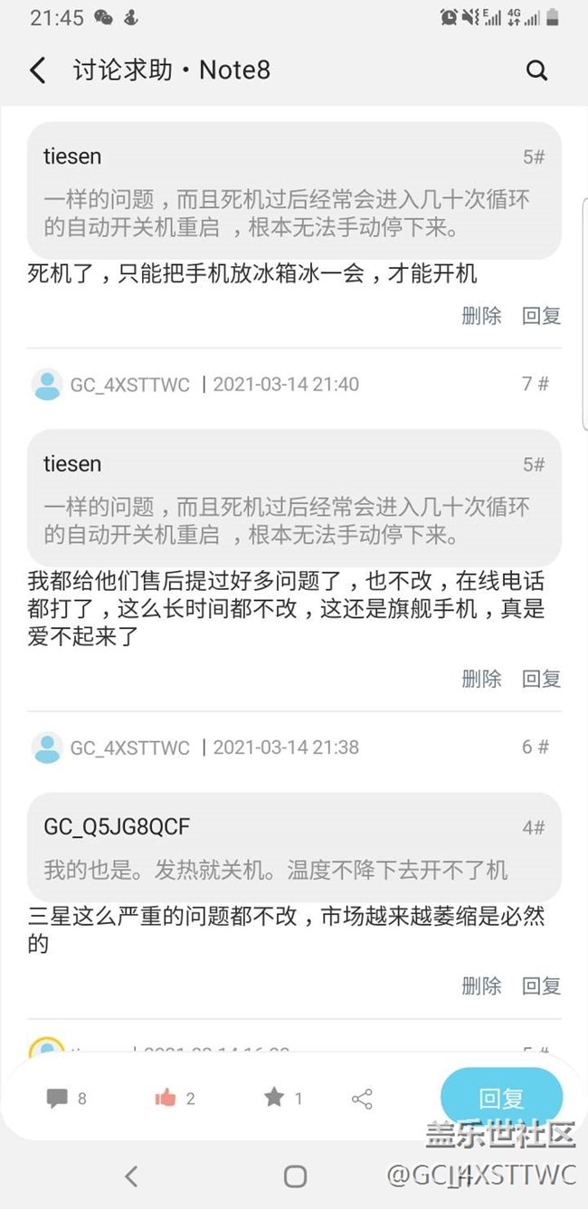 三星手機(jī)死機(jī)這種嚴(yán)重問題都不解決,希望三星能看到這個(gè)帖子,已經(jīng)反饋給售后了,沒有收到任何結(jié)果,只能發(fā)帖求救了,求版主給過不要?jiǎng)h帖,圖片是其他用戶反饋的一樣問題