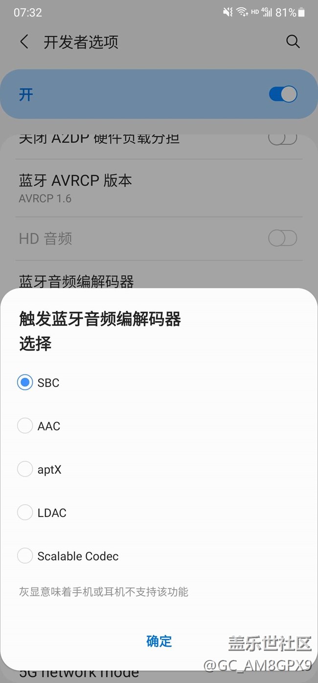 看圖片,進(jìn)去開(kāi)發(fā)者選項(xiàng),其他都是灰色無(wú)法選擇,只能用sbc,是不是三星閹割了ldac和其它編碼?小米o(hù)ppo都支持lhdcv3 了,對(duì)藍(lán)牙耳機(jī)低延遲高音質(zhì)非常關(guān)鍵