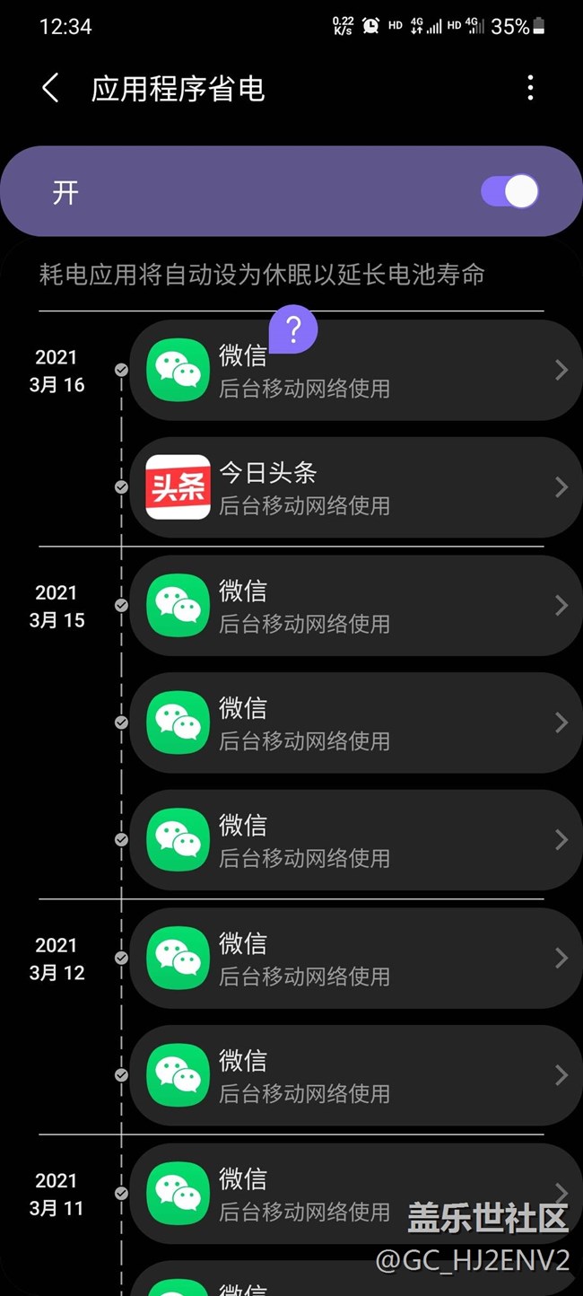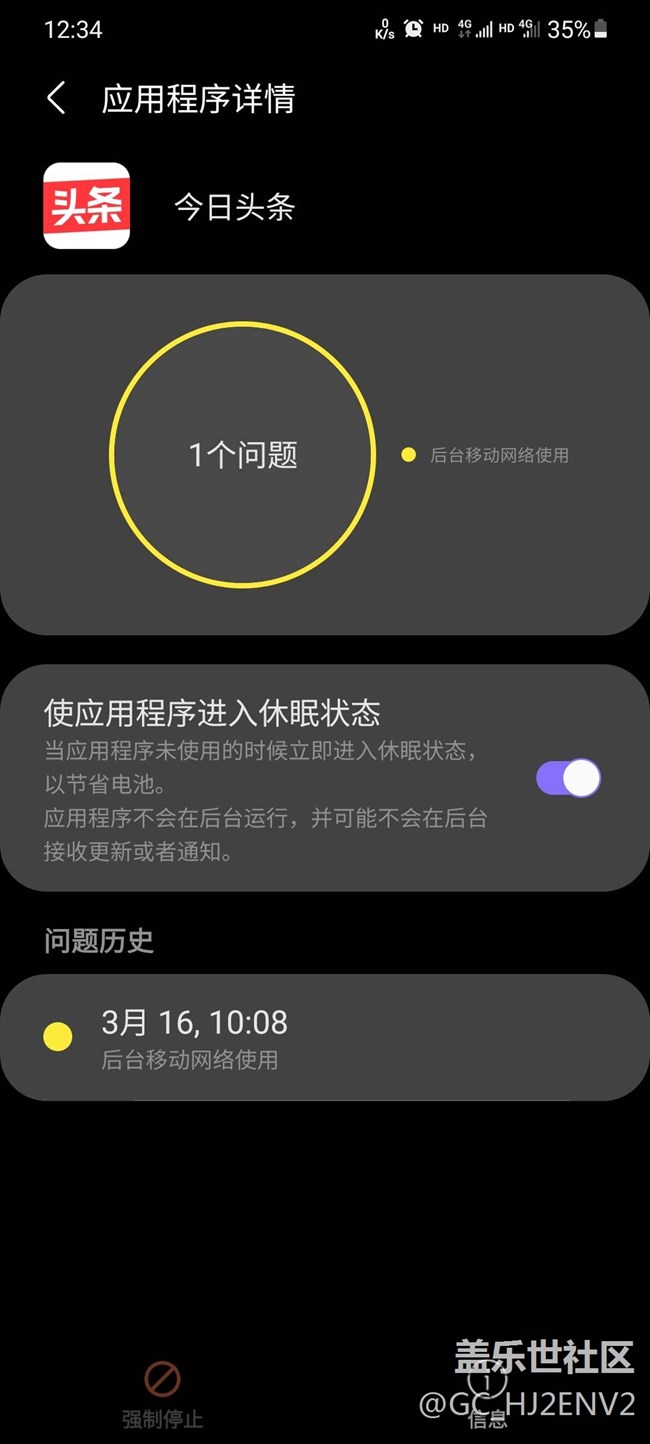 頭條應(yīng)用程序設(shè)置了不允許自啟動(dòng),不允許后臺(tái)使用數(shù)據(jù),深度休眠。但是息屏后應(yīng)用程序不會(huì)進(jìn)入休眠,也不會(huì)被清理后臺(tái)。