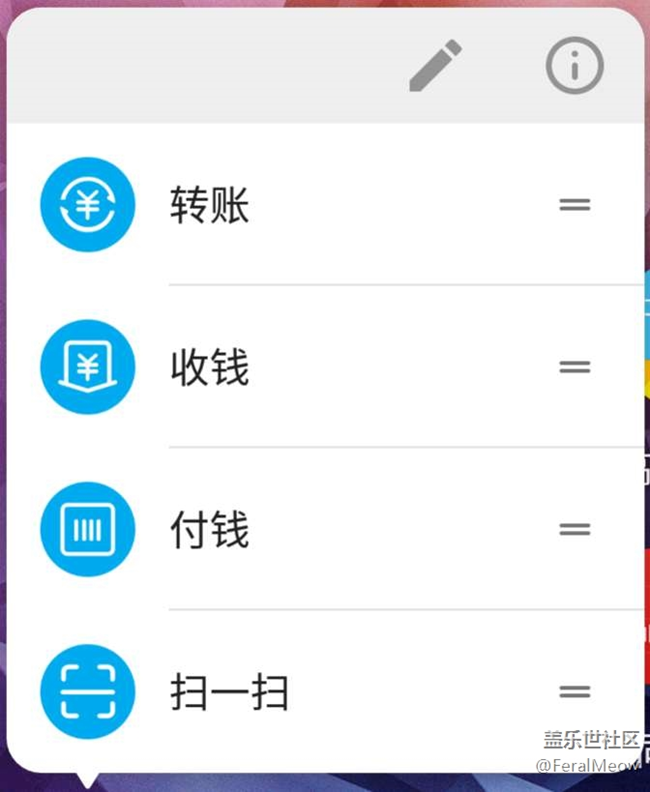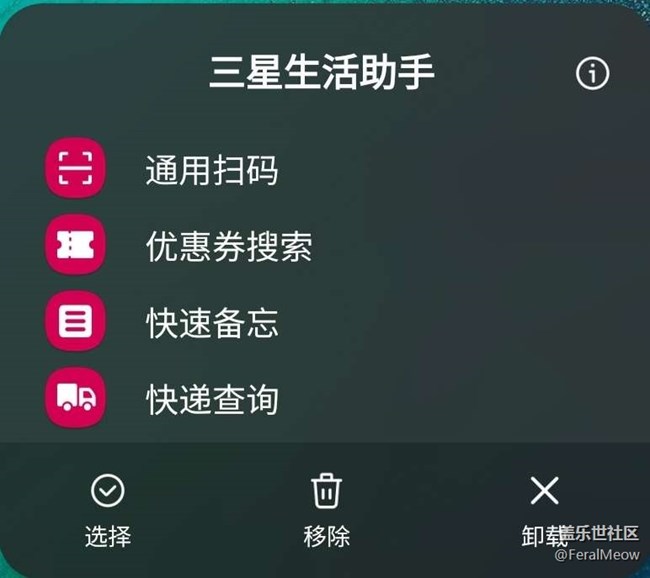 這是一個(gè)常見的 one ui 3.0 下的應(yīng)用長按彈出菜單。除開應(yīng)用自己設(shè)置的快捷菜單項(xiàng),還包括應(yīng)用管理和應(yīng)用詳情(感嘆號)。然而后兩者比應(yīng)用自己的菜單項(xiàng)還大,這幾個(gè)占地方的按鈕對于使用應(yīng)用抽屜桌面的用戶更是累贅。