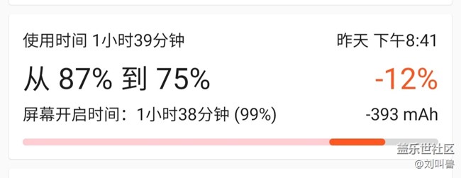 昨天突發(fā)奇想,試試本地播放視頻,下了一個(gè)1080的電影,本地播放,亮度和聲音調(diào)整為50%。86的電,播放完還有73的電,耗電11%。智能管理器顯示耗電14%,accubattery顯示耗電12%,按1.5小時(shí)12個(gè)電計(jì)算。滿電情況下,能播放6,7個(gè)1.5小時(shí)的電影,綜合亮屏能達(dá)到10小時(shí)左右。