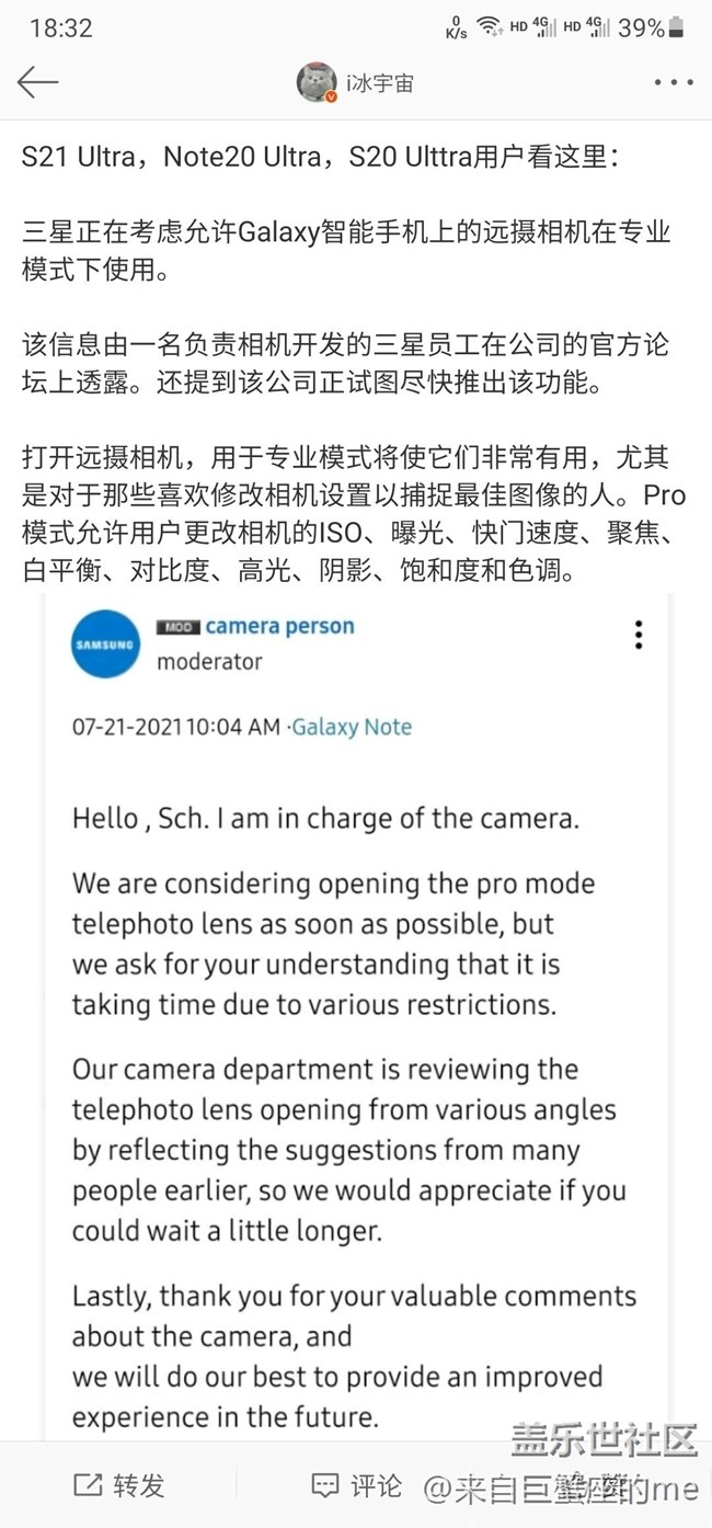 三星將把長焦功能加入到專業(yè)模式中,并且還有Pro專業(yè)模式,支持聚焦那些什么的,但是我個人覺得專業(yè)模式還不夠完善,還要加入實時HDR功能,以及支持專業(yè)模式的108MP模式也就是在專業(yè)模式里面加入1億像素選項,我覺得這樣的要求對于三星來說不難,就看三星有沒有心去做了