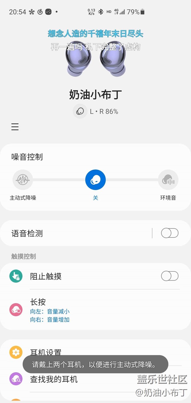 我的buds pro最近出現(xiàn)了兩只一起佩戴連接后無(wú)法開(kāi)啟降噪模式的問(wèn)題 提示我?guī)蟽芍欢鷻C(jī) 一起放到耳機(jī)后重新拿出來(lái)也不能開(kāi)啟 重復(fù)下圖提醒 如果同時(shí)拿出來(lái)放到耳朵里后開(kāi)啟藍(lán)牙 能明顯聽(tīng)出右耳先連接 左耳后連接 依然無(wú)法開(kāi)啟降噪 如果開(kāi)啟環(huán)境音模式只有右耳有環(huán)境音 左耳仍然是默認(rèn)噪音模式關(guān) 請(qǐng)問(wèn)這種問(wèn)題怎么解決