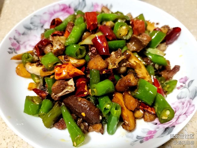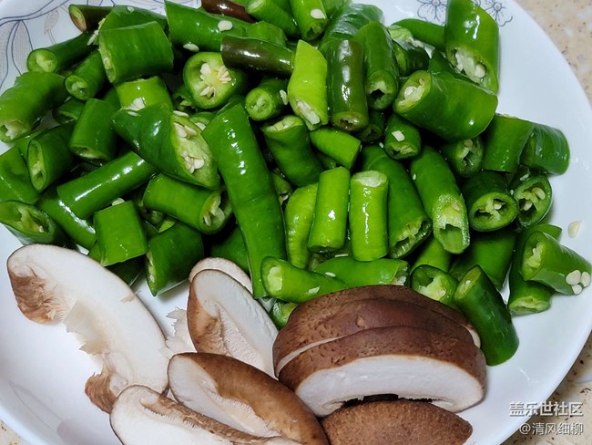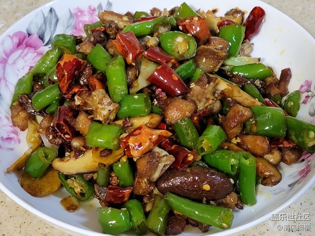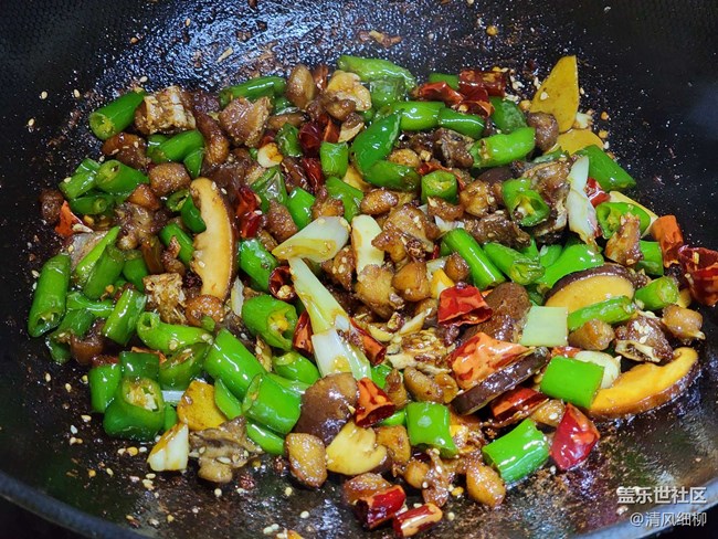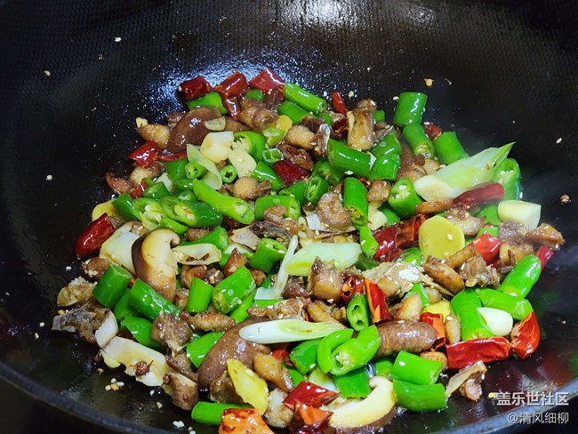 配料:青椒(螺絲椒也可)五個切成一公分長的段,干辣椒段適量(干辣椒用水清洗一下,避免下鍋焦糊),干花椒一小把,姜片、蒜片,兩朵香菇切片,還可以配萵筍條或者藕條。