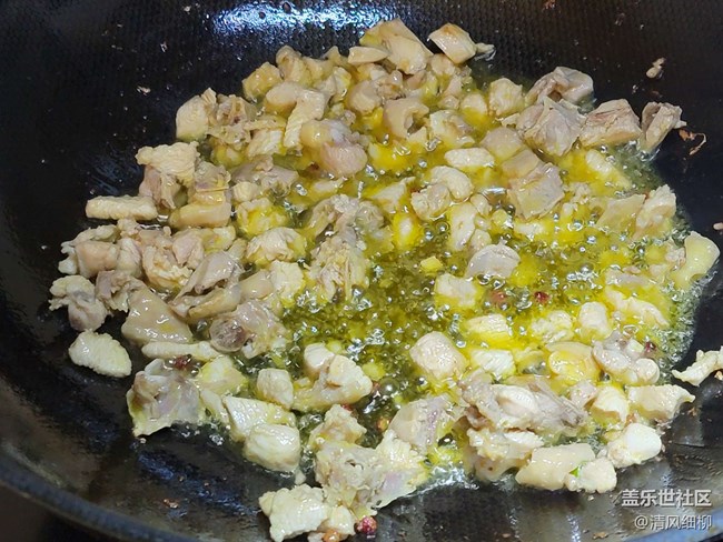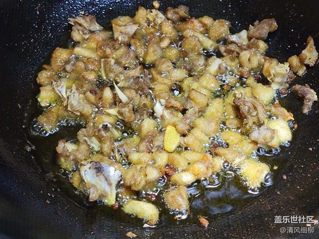 小煎雞不用汆水,鐵鍋燒熱倒入10克菜籽油燒滾冒煙倒出,另外加入菜籽油50克,這是為了雞塊不粘鍋。中火倒入雞塊,慢慢翻炒。直到油變清亮(不到火候的油是渾濁不清的),雞塊表面成深黃色。