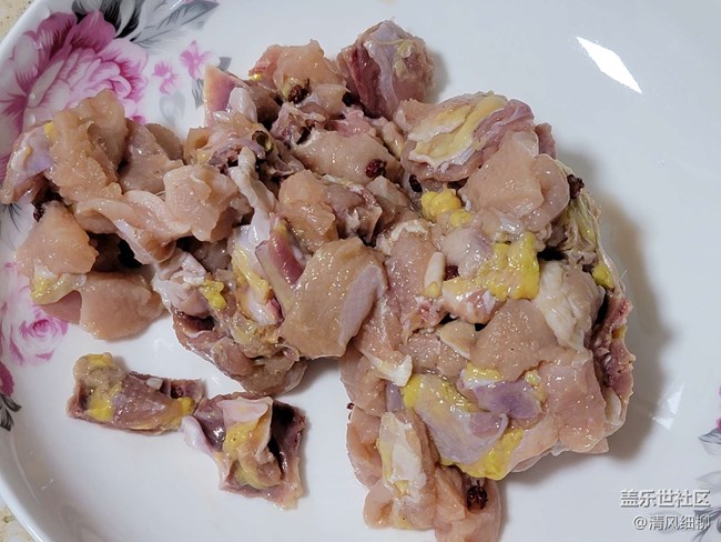 選小雞公半只(嫩雞公),帶骨砍成小丁(小指頭大小合適),用大蔥、姜片、花椒、料酒和鹽適量拌勻腌制十分鐘后,撿除姜蔥,擠去水分備用。