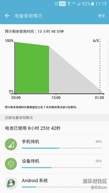 本人一共買來升了2次應該,但是最后一次升級說是更加省電,但是從實際待機來看反而更加耗電了。。。這又是什么情況。 本人昨天晚上做了測試,充電100,Wi-Fi.藍牙,應用程序全部關閉,待機。不過息屏顯示還是開著的,是夜間模式。今天醒來差不多每個小時耗電1點,一個晚上變成92了。