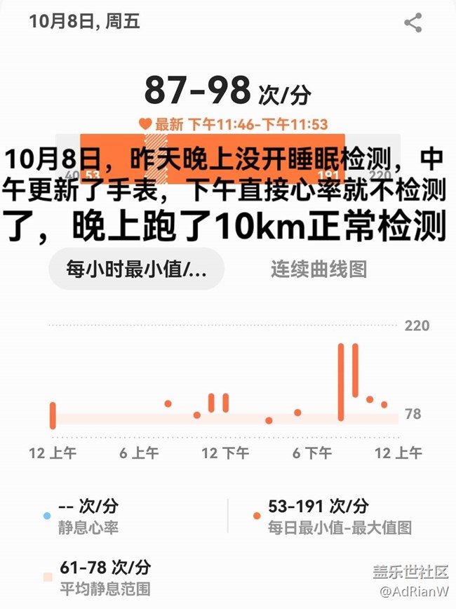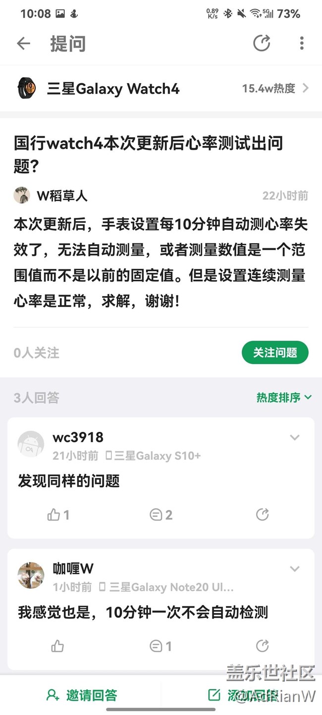 8號(hào)軟件更新之后10分鐘檢測(cè)心率出問(wèn)題了(圖1,2,3),基安上還有一些別的用戶也反映了又問(wèn)題(圖6)。開(kāi)啟靜止時(shí)10分鐘檢測(cè)一次心率就沒(méi)有自動(dòng)測(cè)過(guò),我后來(lái)感覺(jué)不對(duì)自己手動(dòng)測(cè)的結(jié)果在三星健康里顯示成自動(dòng)測(cè)量(圖5)。連續(xù)測(cè)量還是正常的,不知道是咋回事。