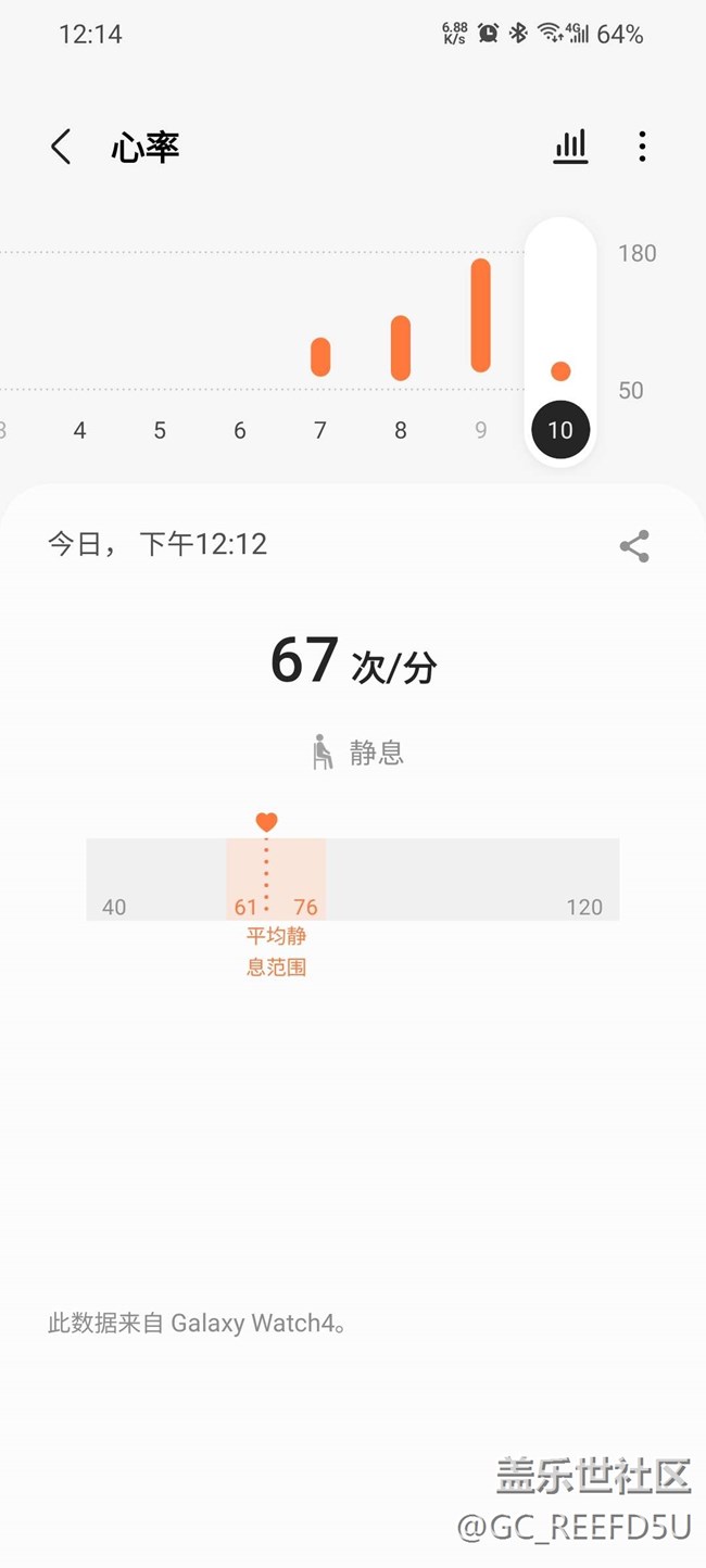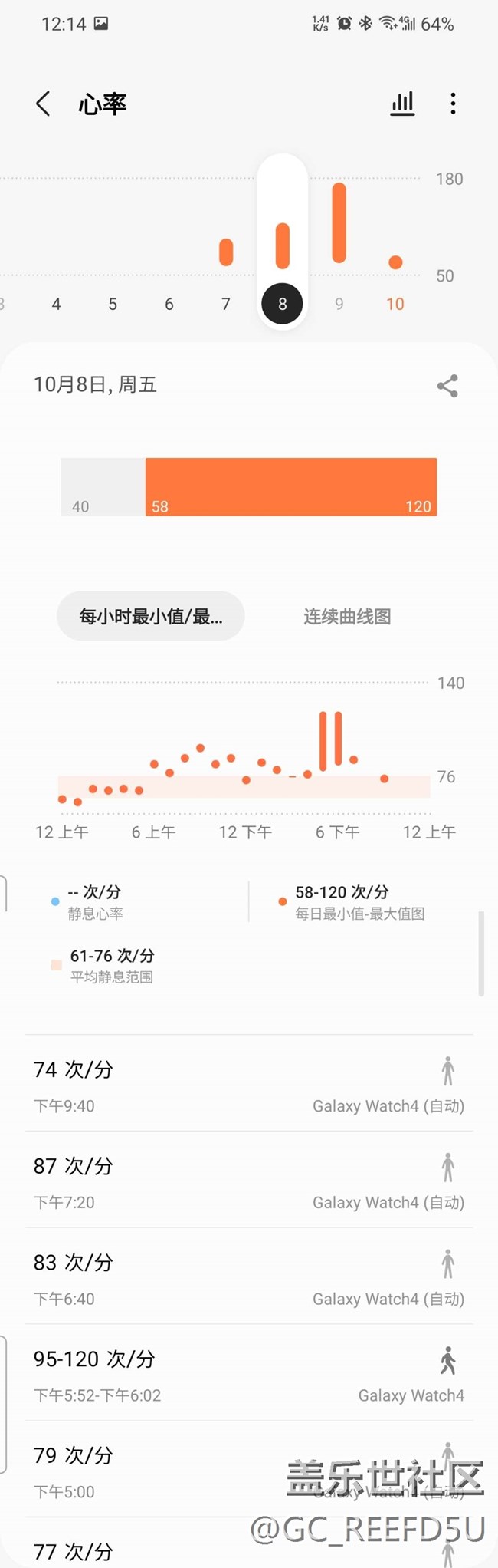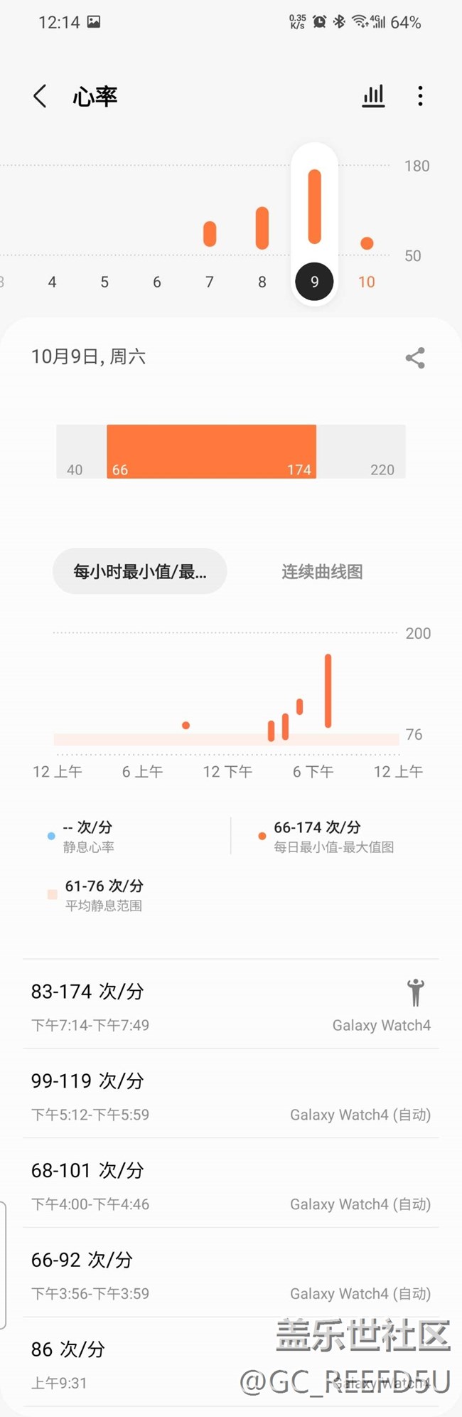 如前三張圖所示,展示的是10號(hào) 9號(hào) 8號(hào)三天心率檢測(cè)的數(shù)據(jù),一直開的都是10分鐘1次的檢測(cè)模式。其中8號(hào)(第三張圖)數(shù)據(jù)分布均勻細(xì)密,9號(hào)(第二張圖)只有1個(gè)點(diǎn)(這是我手動(dòng)測(cè)量的)和后面的長條(第一個(gè)長條是我發(fā)現(xiàn)有問題切換了一直測(cè)量模式,后面都是運(yùn)動(dòng)時(shí)的數(shù)據(jù)),10號(hào)(第一張圖)則完全沒有自動(dòng)檢測(cè)的數(shù)據(jù)。