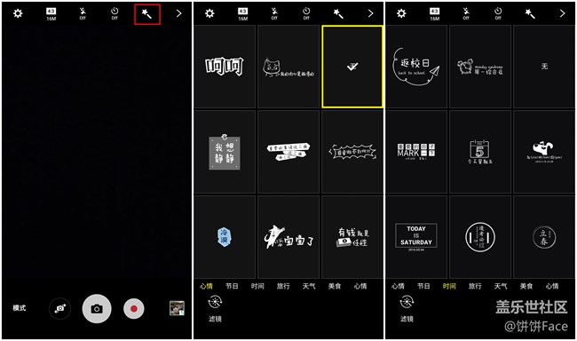 那么如何開啟社交相機呢?其實很簡單,打開相機點擊屏幕右上角,如上圖所示便可找到你中意的濾鏡貼紙了!