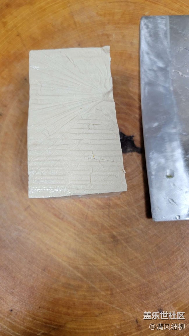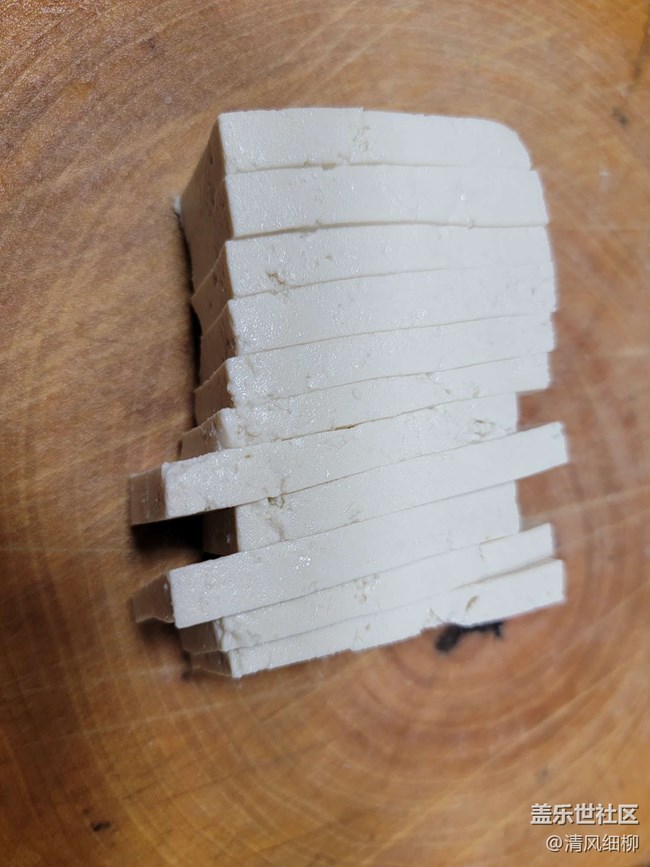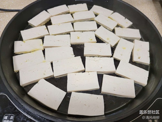 豆腐選用老一點的水豆腐一塊,切成3mm厚的片,在鍋里煎。為了和豬肉肥肉有形似,只煎一面到金黃,另一面不煎,一面黃一面白,像不像回鍋肉。