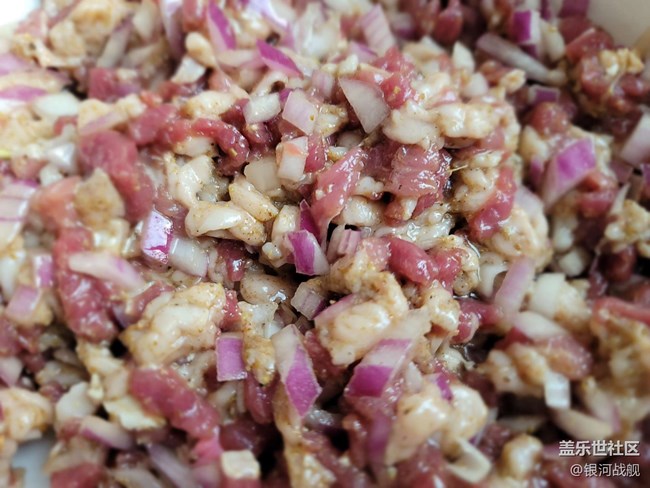 首先羊肉肥瘦比例3:7,切丁,洋蔥切丁,撒上胡椒粉,孜然,食鹽,植物油,攪拌均勻備用。