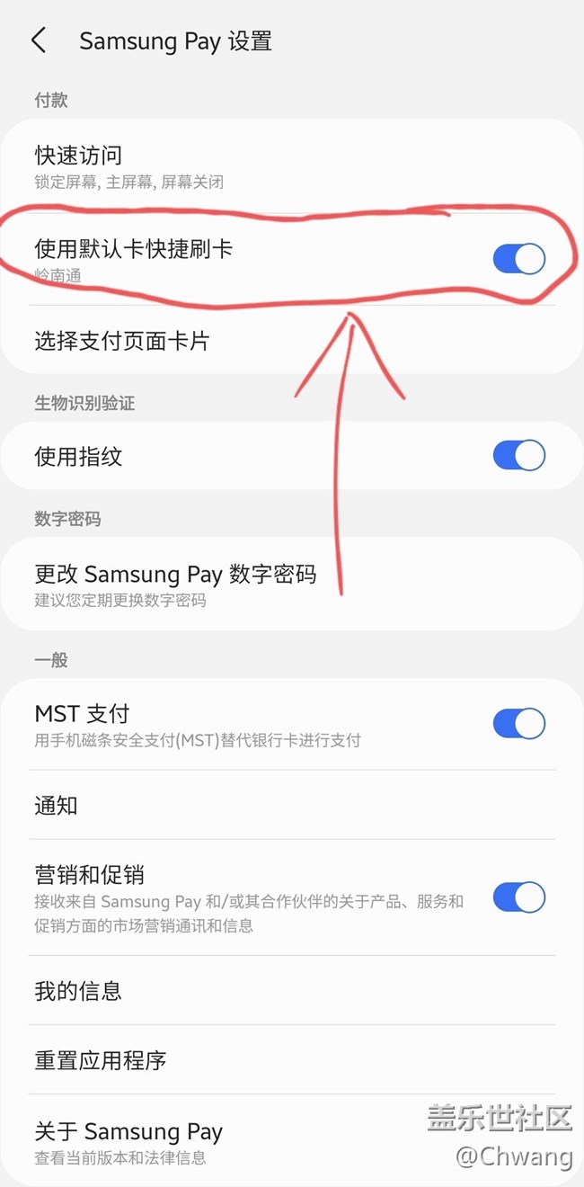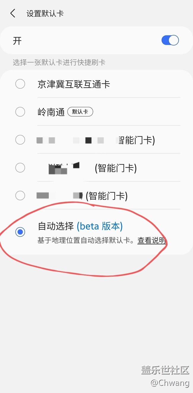 突然活見鬼地發(fā)現(xiàn)Samsung pay支持自動選擇門禁啦,它沒有突出可點擊進入更多設(shè)置的樣式,就是開關(guān)旁邊同一行類似有個節(jié)點