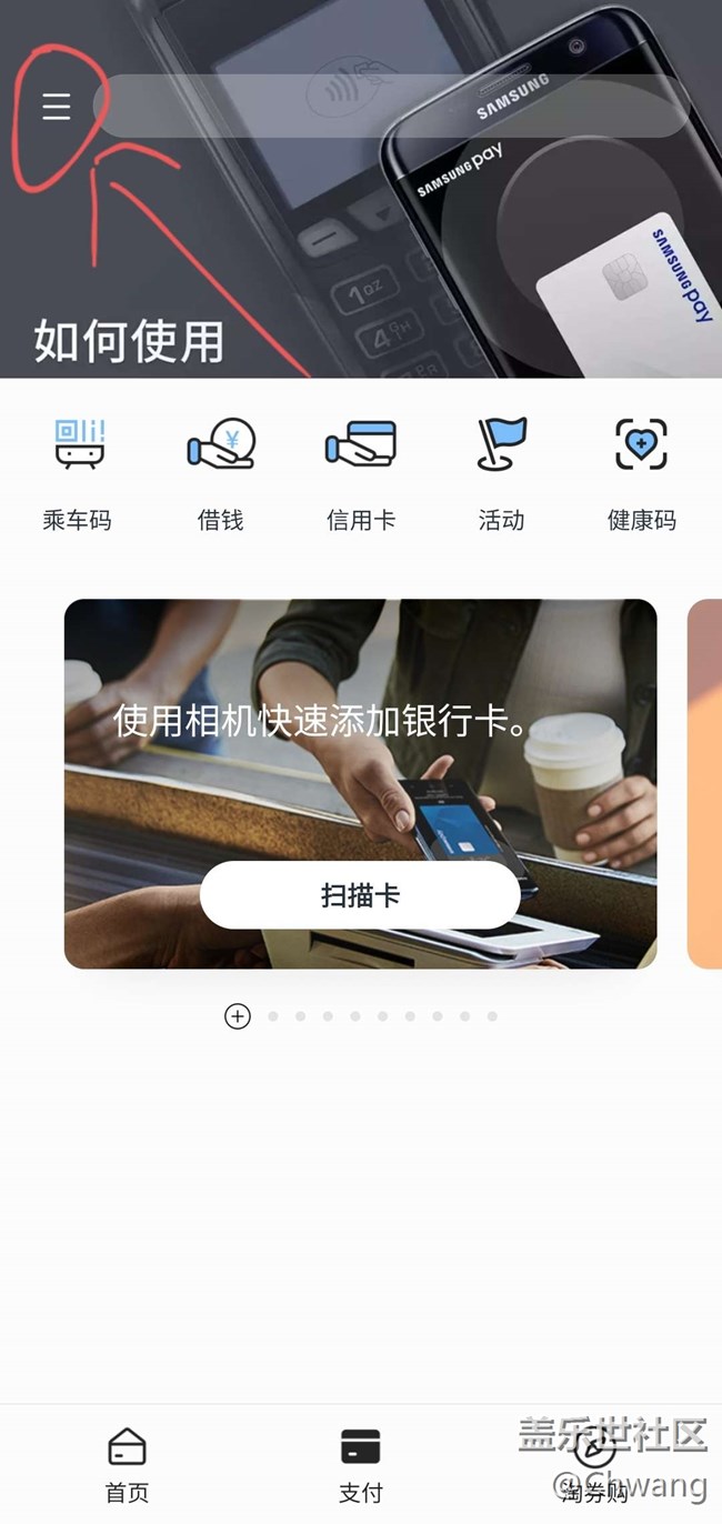打開Samsung pay主頁點擊左上角的“三”再點擊齒輪設(shè)置