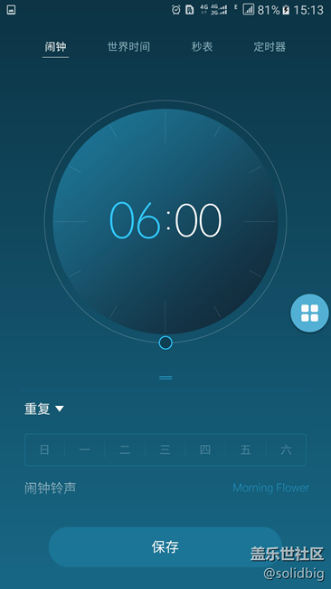• 鬧鐘設(shè)置界面,調(diào)整時(shí)間更方便了,轉(zhuǎn)動(dòng)圓圈就可快速變換時(shí)間,如下圖: