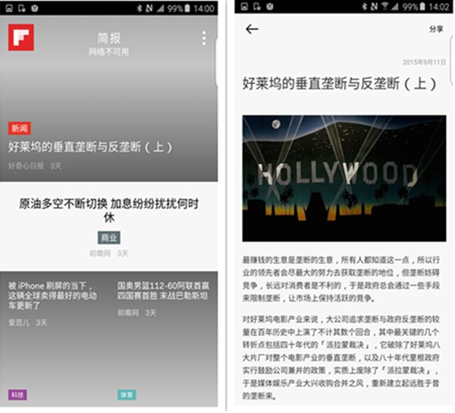 主屏向左滑動(dòng)便是咨詢(xún)頁(yè)面,S6 edge+直接采用了頗具國(guó)際范的FlipBoard而不是目前國(guó)內(nèi)比較流行的ZAKER,算是擺出了大廠姿態(tài)。