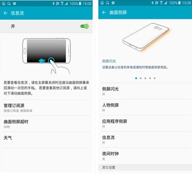 關(guān)于這塊曲面屏的特殊應(yīng)用,除了來(lái)電跑馬燈這個(gè)比較炫酷的形式以外,一是APP快捷打開(kāi)菜單,二來(lái)則是資訊在側(cè)邊欄的顯示。