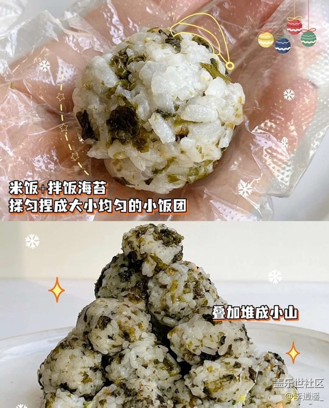 1??米飯?拌飯海苔揉勻捏成大小均勻的小飯團(tuán)
