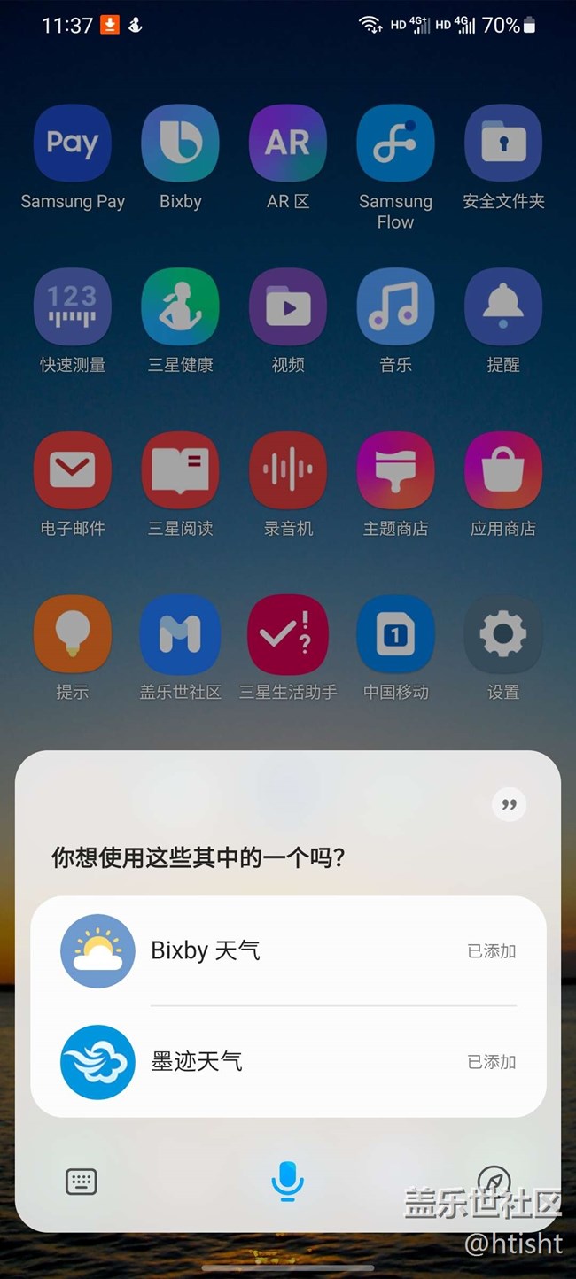 問bixby今天天氣怎么樣的時(shí)候,彈出來對(duì)話框,讓選擇Bixby天氣和墨跡天氣,可是這墨跡天氣我也沒安裝啊,也找不到地方卸載,請(qǐng)問這墨跡天氣在哪刪除啊呢?