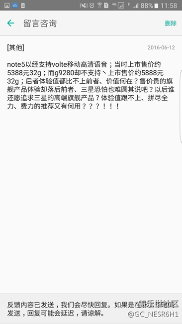 note5以經(jīng)支持volte移動高清語音、當(dāng)初上市售價約5388元32g而g9280上市售價約5888元32g、售價貴的旗艦產(chǎn)品卻比不上前者旗艦產(chǎn)品的體驗(yàn)值!三星能給客戶一個滿意的簽復(fù)嗎?體驗(yàn)值沒有旗艦意義何在?拼盡全力的推薦旗艦又有何意義?消費(fèi)者以后購買旗艦產(chǎn)品恐怕得達(dá)到三星工程師的水準(zhǔn)、對其產(chǎn)品從設(shè)計(jì)、參數(shù)、實(shí)驗(yàn)等等相關(guān)性能、得研究個一年、兩年的研究透了才敢購買其產(chǎn)品!才少些后悔…………