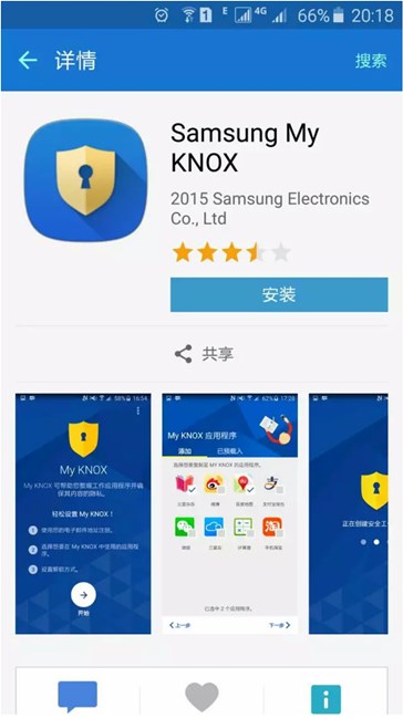 2. 只要在手機自帶的三星應(yīng)用商店能搜索到“Samsung my knox”,那么恭喜你就可以使用2個微信哦!以上圖片來源于三星GalaxyS6測試截圖,由于三星手機機型較多,具體操作步驟以實際手機為準(zhǔn)。