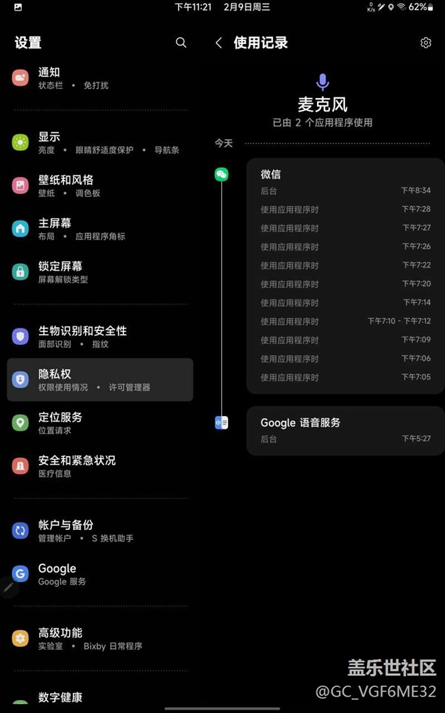 右上角的小綠點(diǎn)一直常亮,麥克風(fēng)一直被調(diào)用。我嘗試關(guān)掉后臺(tái)所有應(yīng)用但沒有改變這一情況,我到隱私權(quán)限授權(quán)情況中找不到除微信和Google語音服務(wù)以外的軟件調(diào)用麥克風(fēng),我試著把這2個(gè)軟件也關(guān)掉但是,還是不能解決問題。