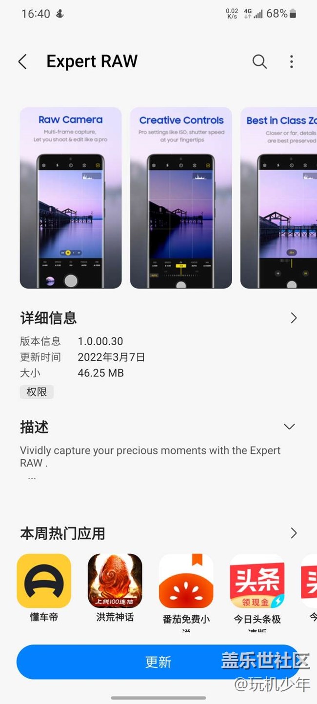 國行應(yīng)用商店可以更新了三星專家相機(jī)軟件。 圖片