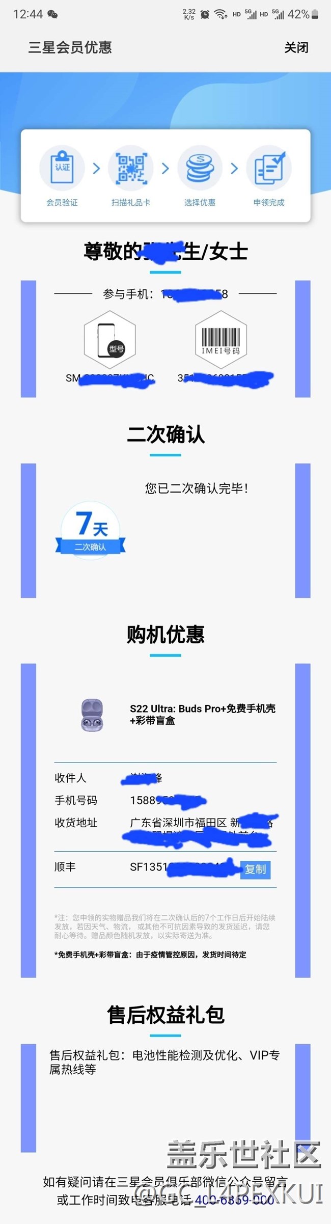 本人2.25號深圳蘇寧門店購買的先行者,3.4號二次確認,到現(xiàn)在沒有收到任何贈品,今天聯(lián)系三星會員俱樂部官方微信公眾號答復已經(jīng)發(fā)順豐快遞并且給了我一個順豐快遞單號,讓我聯(lián)系順豐,我聯(lián)系順豐告訴我收貨人電話不是我地址也不是深圳,而且這個快遞已經(jīng)派送了,聯(lián)系三星官網(wǎng)電話說給我反饋到三星會員俱樂部,至今無果,而且三星會員俱樂部那個公示的號碼4006869000就是一個機器人,根本沒有人接聽電話的。再次聯(lián)系三星會員俱樂部微信又說是順豐快遞員把地址搞錯,后面我把順豐快遞電話錄音給三星會員俱樂部,又改口說是因為深圳疫情不能發(fā)貨,你深圳疫情影響為什么我申領里面有順豐快遞單號,而且查詢這個快遞單號已經(jīng)派送,這就是三星的服務態(tài)度,贈品由三星官網(wǎng)發(fā)貨,卻搞這么大的烏龍。