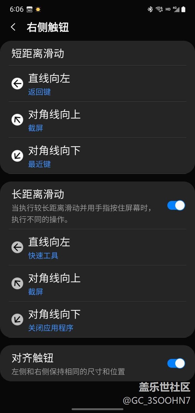 第二步:點(diǎn)擊右側(cè)觸鈕或左側(cè)觸鈕,先后選中短距離滑動(dòng)和長(zhǎng)距離滑動(dòng),同時(shí)設(shè)定一種手勢(shì)功能均為截圖。(這一步是保證同一手勢(shì)不發(fā)生誤觸,并提高截圖成功率)