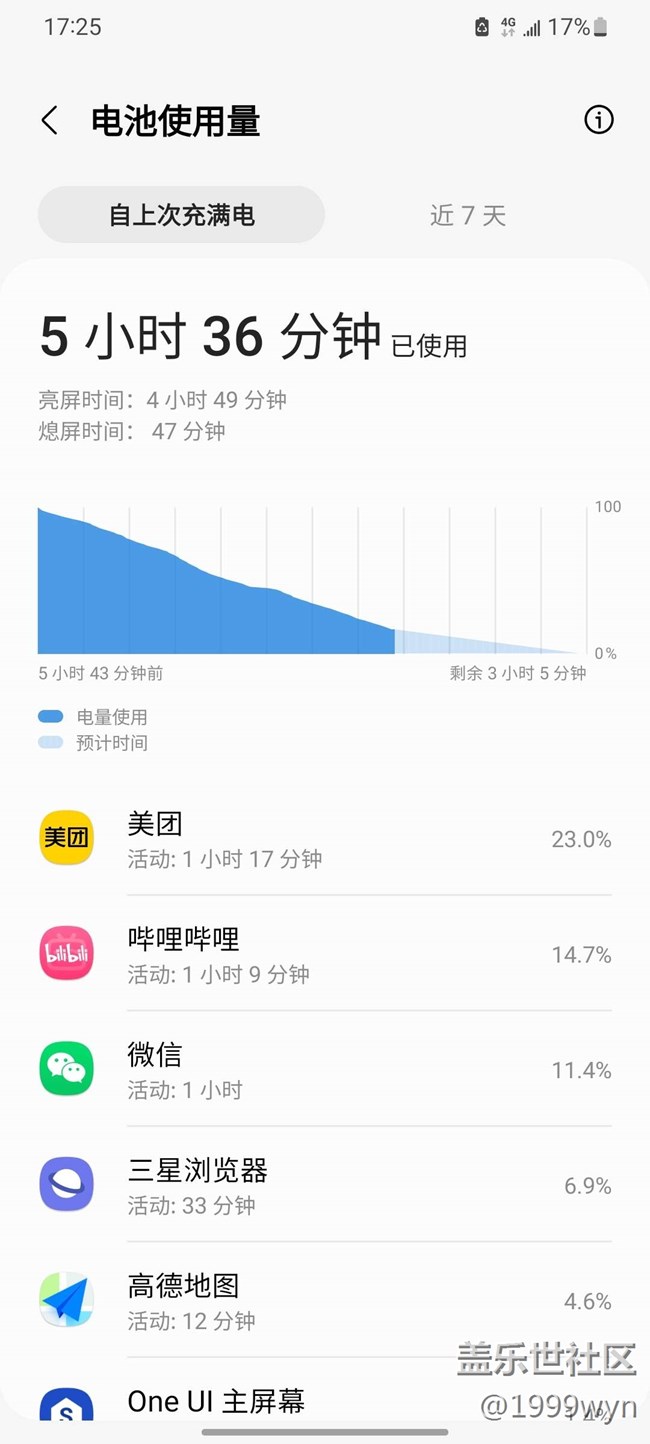 用的1080p,4G,開了省電模式,這相當(dāng)于一直用了,息屏還不到1小時,算是三星最耐用的方式了(眾所周知,三星待機非常耗電,還不如一直用),算下來大概是5小時亮屏,要是不用美團的話,感覺還能好一些
