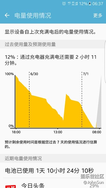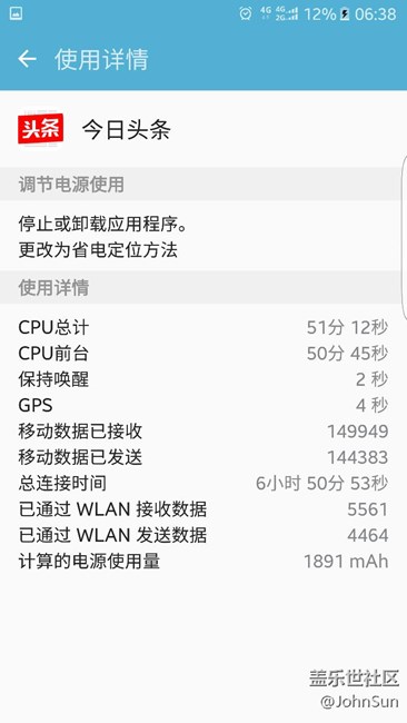 晚上還是41%的電,關(guān)閉所有后臺睡覺。早上起床已經(jīng)關(guān)機。鬧鈴失效。今日頭條一晚上都在喚醒CPU。具體看圖