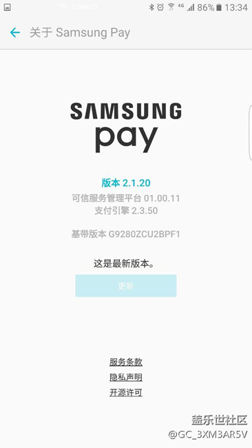 剛剛更新了samsung pay,已升級至2.1.20