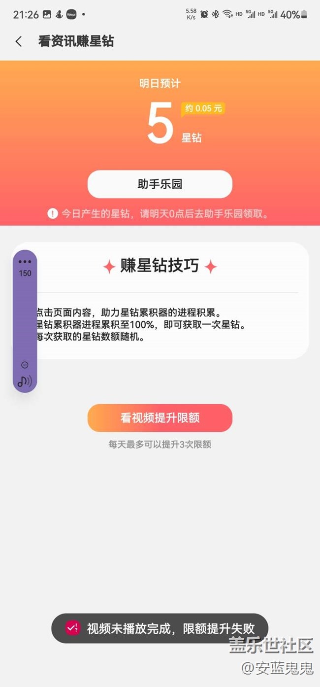 資訊看視頻完了不能提額怎么回事。 圖片
