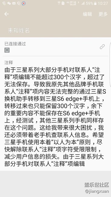 由于三星系列大部分手機對聯(lián)系人“注釋”項編輯不能超過300個漢字,超過了無法保存。導致我原先其他品牌手機聯(lián)系人“注釋”項內容無法完整的通過三星S換機助手轉移到三星S6 edge+手機上,轉移過來也只能保留300個漢字,余下的重要內容不能保存在S6 edge+手機上,經(jīng)測試,其他三星系列手機同樣存在這個問題。這給我?guī)砗艽罄_,我還必須帶著老手機查聯(lián)系人信息。希望三星手機使用本著“以人為本”原則,盡快解除聯(lián)系人“注釋”項字符受限限制,減少用戶信息的損失。