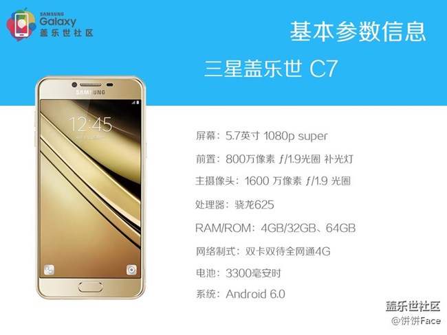 配置方面,三星蓋樂世 C7搭載驍龍625八核64位處理器,支持雙卡雙待全網(wǎng)通,卡2為多功能卡槽支持MicroSD存儲卡拓展,最大支持128GB;配備4GB內(nèi) 存+32GB機(jī)身存儲,電池容量為3300mAh。除此之外,三星Galaxy C7還支持Samsung Pay、指紋識別以及急速充電功能。