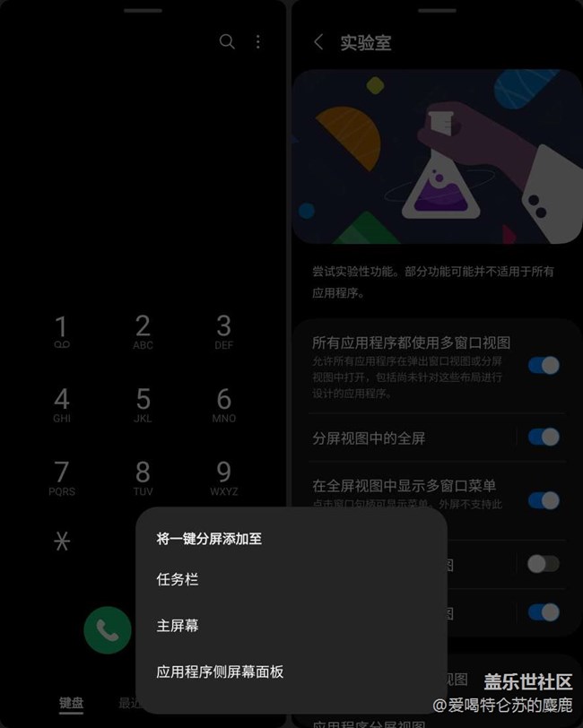 還有就是在實(shí)驗(yàn)室中,可以實(shí)現(xiàn)雙指邊緣滑動(dòng)來實(shí)現(xiàn)快速分屏,還有快捷的分屏菜單,小小的和導(dǎo)航鍵很像在內(nèi)屏程序的正上方,非常便捷