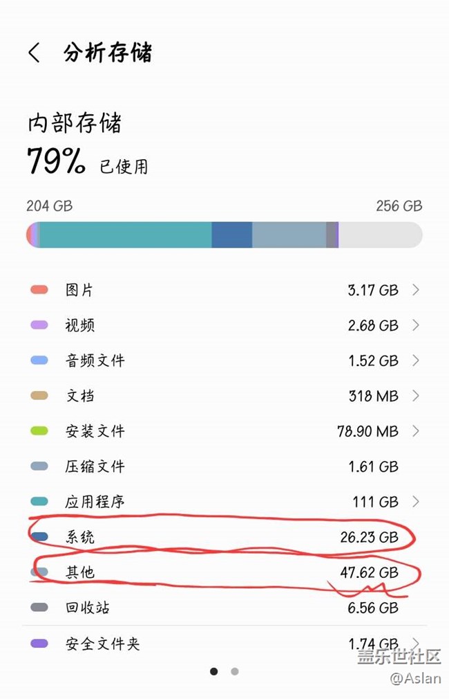 存儲分析中有個“其他”,占用高達48G,256G的手機,這一項占用了1/5的空間,關鍵是還找不到清理的入口。