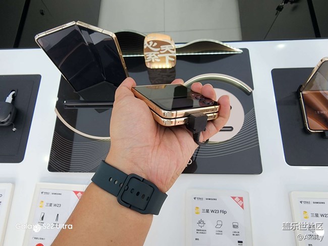 到現(xiàn)場體驗了W23以及W23 Flip的真機(jī),外觀真的是很有質(zhì)感,黑色機(jī)身配上淡金色的鉸鏈和邊框給人感覺大氣而不媚俗。手感也非常好,還是業(yè)內(nèi)唯一支持IPX8防水的折疊屏,好看又實用。