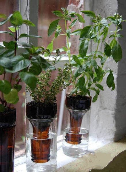 另一半裝水,這樣一來,花草能通過瓶口吸收水分,你只需要在出差之前把“花盆”的下半部分,加滿水即可,就能保證1個月不用澆水啦。