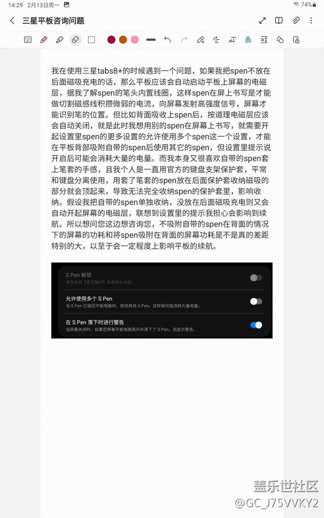 我在使用三星tabs8+的時候遇到一個問題,如果我把spen不放在后面磁吸充電的話,那么平板應該會自動啟動平板上屏幕的電磁層,這樣spen在屏上書寫是才能做切割磁感線積攢微弱的電流。但比如背面吸收上spen后,按道理電磁層應該會自動關(guān)閉,就是此時我想用別的spen在屏幕上書寫,就需要開起設(shè)置里spen的更多設(shè)置的允許使用多個spen這一個設(shè)置,才能在平板背部吸附自帶的spen后使用其它的spen,但設(shè)置里提示說開啟后可能會消耗大量的電量。而我本身又很喜歡自帶的spen套上筆套的手感,且我個人是一直用官方的鍵盤支架保護套,平常和鍵盤分離使用,用套了筆套的spen放在后面保護套收納磁吸的部分就會頂起來,導致無法完全收納spen的保護套里,影響收納。假設(shè)我把自帶的spen單獨收納,沒放在后面磁吸充電則又會自動開起屏幕的電磁層,聯(lián)想到設(shè)置里的提示我擔心會影響到續(xù)航。所以想問您這邊想咨詢您不吸附自帶的spen在背面的情況下,屏幕的功耗和吸附屏幕的功耗是不是真的差距特別的大,以至于會一定程度上影響平板的續(xù)航。