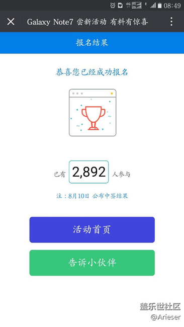 終于報名了,這次活動真的好有誠意,比S7E發(fā)布活動八折強太多,你昨天買的note 5可以抵扣2000,一夜只降2000不到,昨天5000多買的S7E可以抵扣3000,趕快行動吧,謝謝大三星的活動,好保值的大三星,反正我換不起,你們有錢的趕快換。