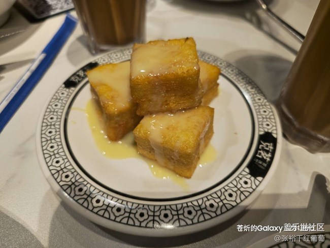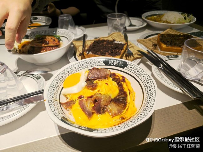 經典的茶餐廳三件套,黯然銷魂飯+小熊冰奶茶+漏奶華,牛叉滑蛋飯+8成熟滑蛋拌飯也很棒