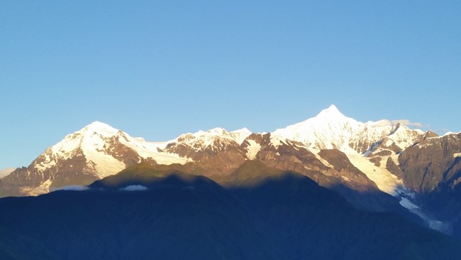 梅里雪山,既有高原的壯麗,又有江南的秀美。在雪山之巔,云霧在寧靜地流淌;在雪山腳下,冰川在寧靜地流淌;在雪山深處,江水在寧靜地流淌……不同的節(jié)奏韻律,同樣的賞心悅目。