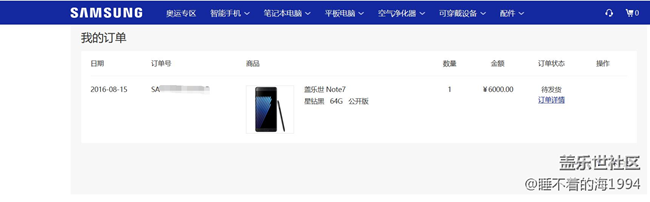 1000先行者落選了,然而三星社區(qū)補加了400部NOTE7,懷著比較忐忑的心情在今天15號13.30在網(wǎng)上商城等候??赡艿却娜颂嗔耍粫r沒有刷新出體驗者入口····。等到14.00點終于發(fā)現(xiàn)了入口,由于我事先已經(jīng)設(shè)置好了會員登錄以及地址。非常順利的下了訂單,漫長的等候NOTE7到手。