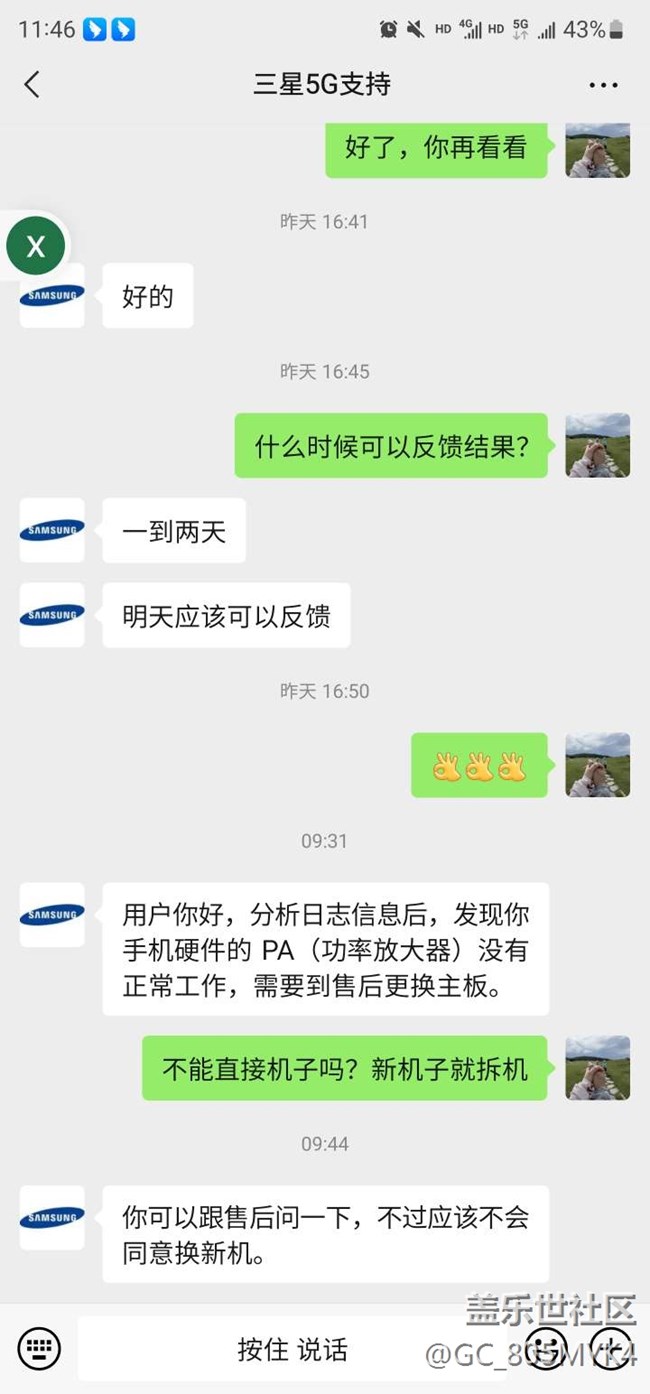 4月初猶豫再三還是沖著網(wǎng)上的測評把40pro+換了S23U,結果沒用幾天發(fā)現(xiàn)移動信號差到?jīng)]辦法打電話,一直以為是軟件更新的原因沒當回事,因為我是雙卡,另一張聯(lián)通信號雖然比不上華為,但也還能接受。線下維修點說移動信號偏弱讓我去論壇發(fā)帖解決。發(fā)了好幾天,客服才聯(lián)系,把錯誤報告轉給三星客服,對方反饋PA功率放大器故障,要換主板。