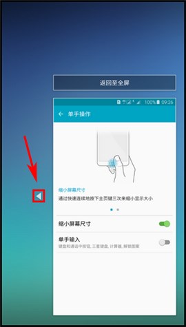 第三步:快速連續(xù)的按下【主頁(yè)鍵】三次可以縮小顯示大小,點(diǎn)擊【箭頭】圖標(biāo),可以將單手操作屏幕調(diào)整至左側(cè),反之亦然,點(diǎn)擊【返回至全屏】,即可返回全屏視圖。
